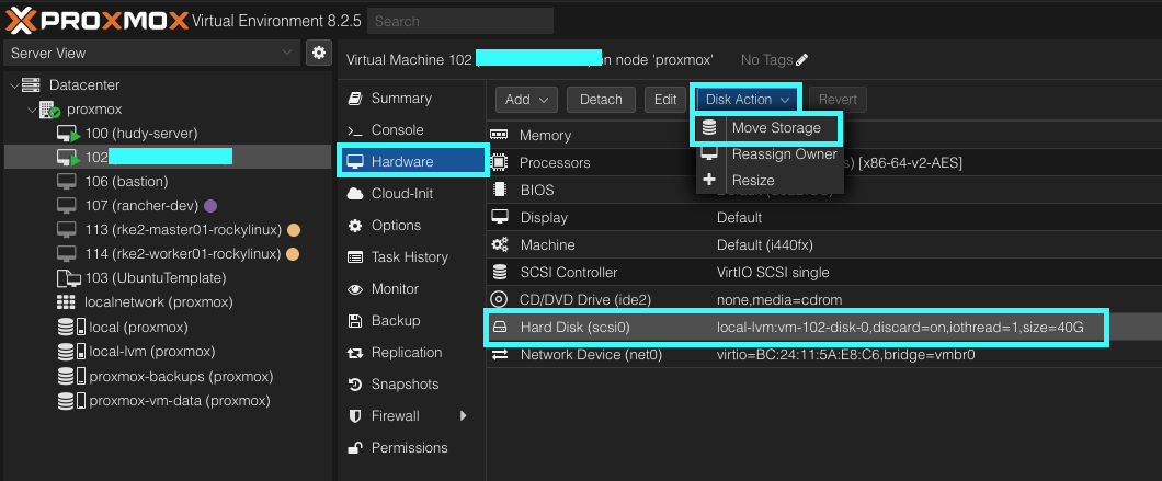 - Select the Hard Disk you wish to migrate (it will display a value similar to local-lvm:vm-102-disk-0).